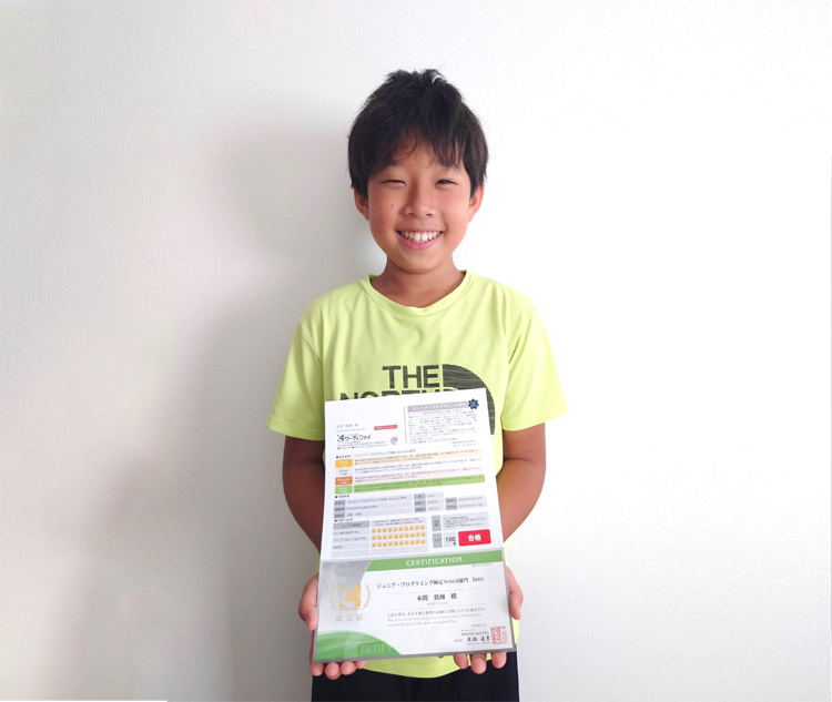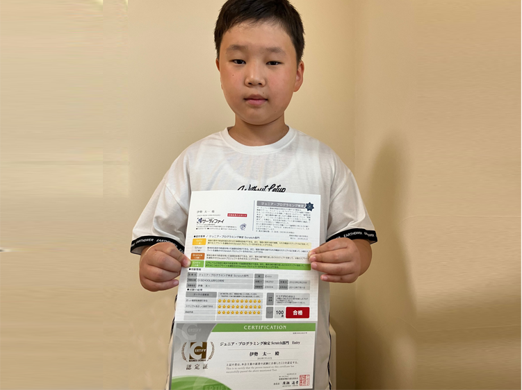 A3.D-SCHOOL山形七日町校に通って1年。先生のすすめで検定試験を受けました。カエルの動きを指示するのがむずかしかったけど、100点で合格できたのでとてもうれしかったです。次の級も合格を目指してがんばっていきたいです。