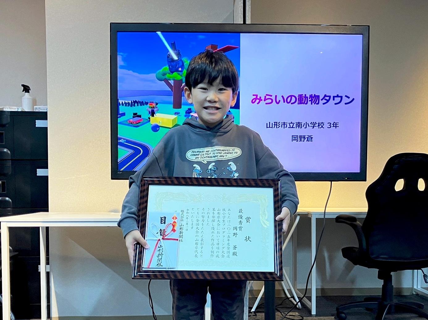 山形市立南小学校3年生の岡野 蒼(おかの あおい)さんが、昨年12月に行われた全国新聞社事業協議会主催の全国選抜小学生プログラミング大会山形県大会の最終審査の結果、山形県代表に選出されました。