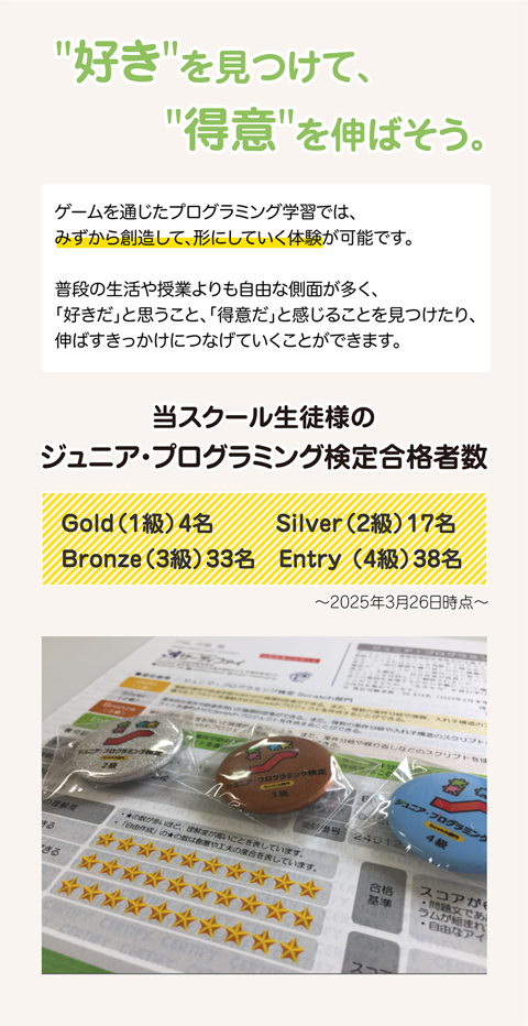 | 2022.05.08 | ジュニア・プログラミング検定の団体受験会場に認定されました。 |